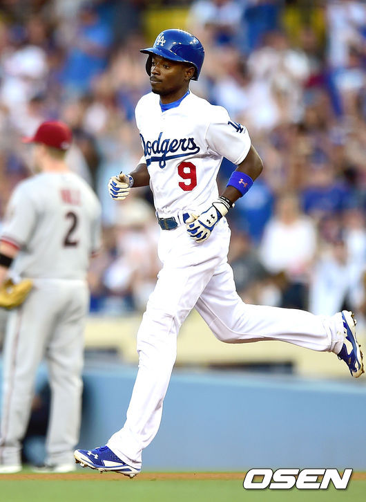 3회말 2사 2루 LA 다저스 디 고든이 투런 홈런을 때린 뒤 베이스를 돌고 있다.