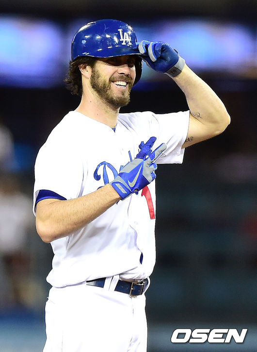 4회말 2사 만루 LA 다저스 댄 해런이 3타점 적시 2루타를 때린 뒤 기뻐하고 있다.