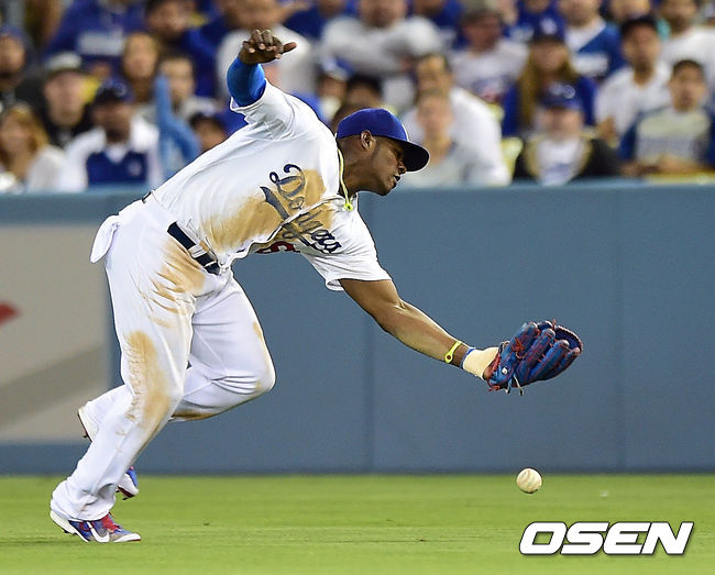 6회말 2사 LA 다저스 푸이그가 애리조나 프라도의 타구를 잡으려다 놓치고 있다.