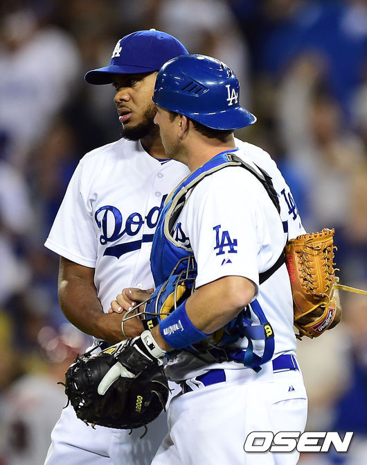 승리를 거둔 LA 다저스 켄리 젠슨과 A.J 엘리스가 기뻐하고 있다./youngrae@osen.co.kr