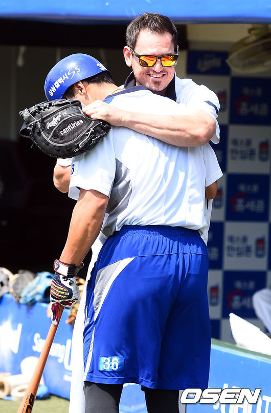 15일 오후 대구구장에서 열리는 2014 한국야쿠르트 세븐 프로야구 삼성 라이온즈와 두산 베어스의 경기에 앞서 두산 칸투와 삼성 이승엽이 포옹을 하고 있다.