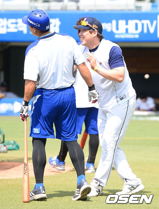 15일 오후 대구구장에서 열리는 2014 한국야쿠르트 세븐 프로야구 삼성 라이온즈와 두산 베어스의 경기에 앞서 두산 김현수가 타격연습하던 삼성 이승엽에게 다가가 장난을 치고 있다.