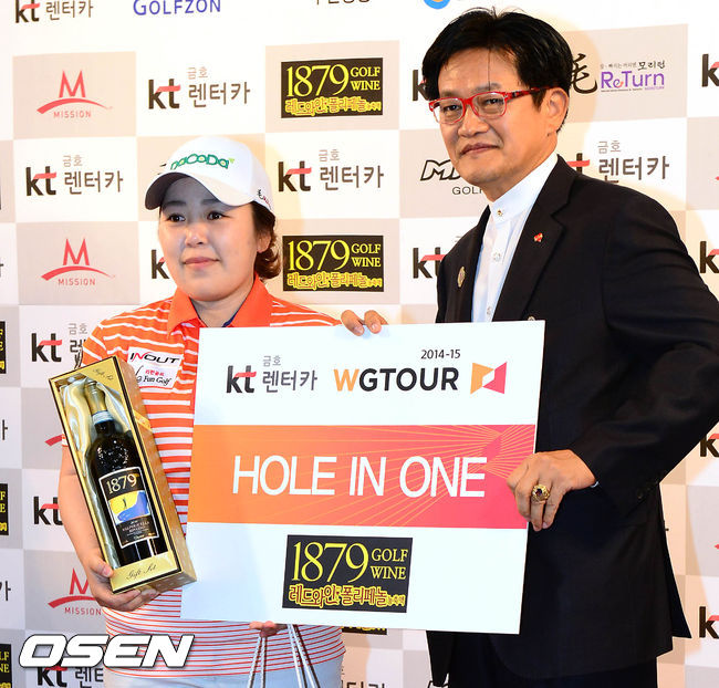홀인원을 성공시킨 강미혜선수가 포토타임을 갖고 있다.