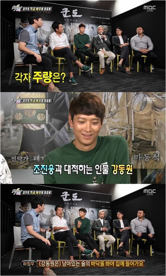 하정우는 15일 방송된 MBC 연예정보프로그램 ‘섹션TV 연예통신’에서 조진웅을 비롯해서 영화 ‘군도’ 출연 배우들이 술자리를 많이 했다는 이야기에 “조진웅 씨는 말술을 뛰어넘는다”고 말했다.