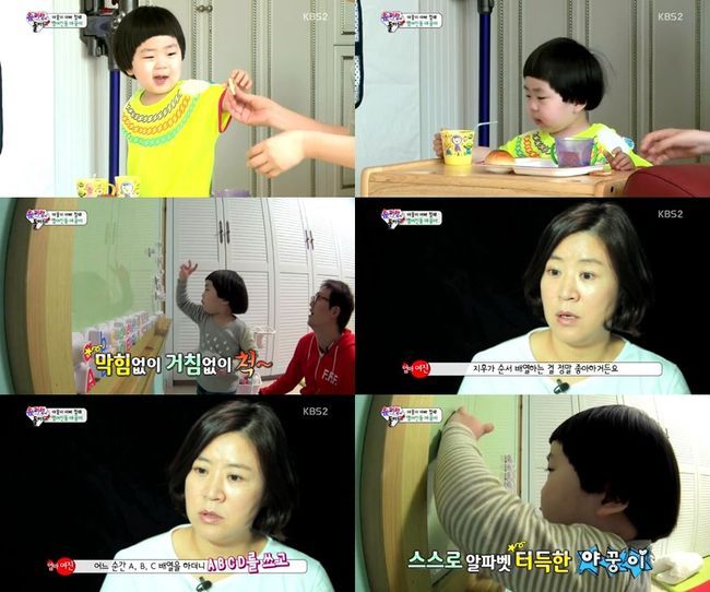 야꿍이는 15일 오후 방송된 KBS 2TV 예능프로그램 '해피선데이-슈퍼맨이 돌아왔다(이하 '슈퍼맨')'에서 스스로 알파벳을 터득, 응용하는 모습을 보여 눈길을 끌었다.