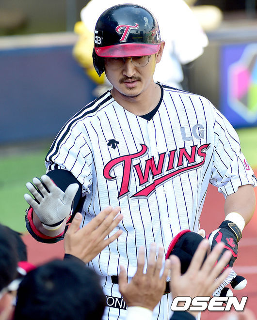1회말 LG 공격 선두타자로 나선 박용택이 선제 좌월 솔로포를 날리고 홈을 밟은 뒤 더그아웃 동료들과 인사를 나누고 있다.