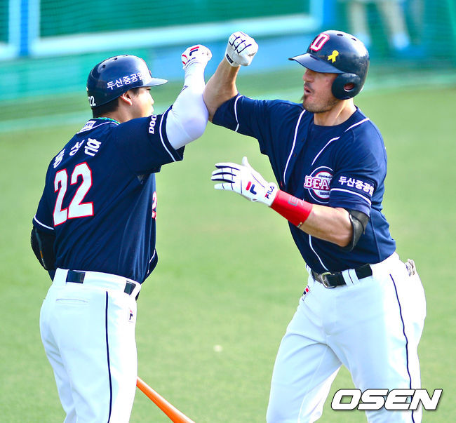 15일 오후 대구구장에서 열린 2014 한국야쿠르트 세븐 프로야구 삼성 라이온즈와 두산 베어스의 경기,2회초 두산 선두타자 칸투가 선취 솔로홈런을 날리고 홍성흔과 하이파이브를 하고 있다