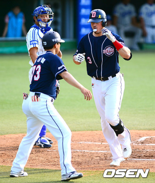 15일 오후 대구구장에서 열린 2014 한국야쿠르트 세븐 프로야구 삼성 라이온즈와 두산 베어스의 경기,2회초 두산 선두타자 칸투가 선취 솔로홈런을 날리고 홈에서 전상렬 코치와 하이파이브를 하고 있다