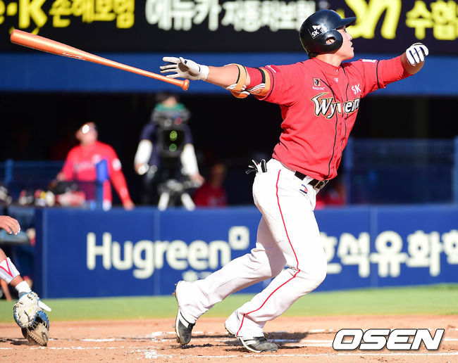 2회초 SK 공격 1사 1, 2루 상황 박윤이 중견수 플라이를 날리고 있다.
