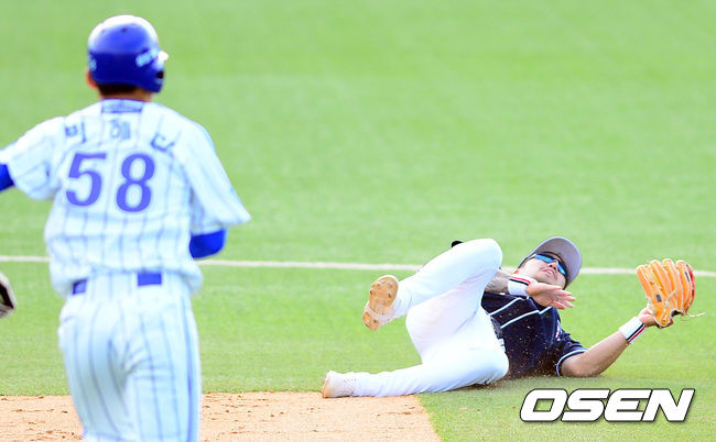 15일 오후 대구구장에서 열린 2014 한국야쿠르트 세븐 프로야구 삼성 라이온즈와 두산 베어스의 경기,2회말 1사 1루 삼성 이지영의 내야안타 타구를 두산 오재원 2루수가 놓치고 있다.