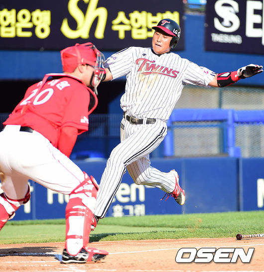 2회말 LG 공격 1사 1, 2루 상황 최경철의 적시 1타점 중전안타 때 2루주자 채은성이 홈까지 내달리고 있다. 홈에서 세이프.