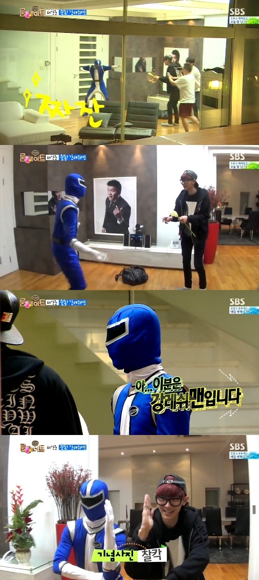 이날 서강준은 후레쉬맨 복장을 입고 멤버들을 기쁘게 해줬다. 서강준은 찬열을 위해서도 다시 한 번 파란 쫄쫄이 후레쉬맨 옷을 입고 대기했다.