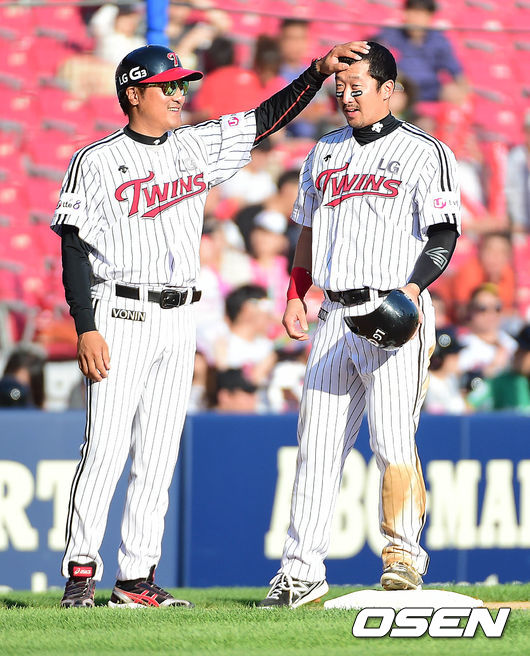 2회말 LG 공격 2사 만루 상황 싹쓸이 3타점 우익수 키를 넘기는 2루타를 날리고 3루까지 진루한 이병규가 최태원 코치와 인사를 나누고 있다.