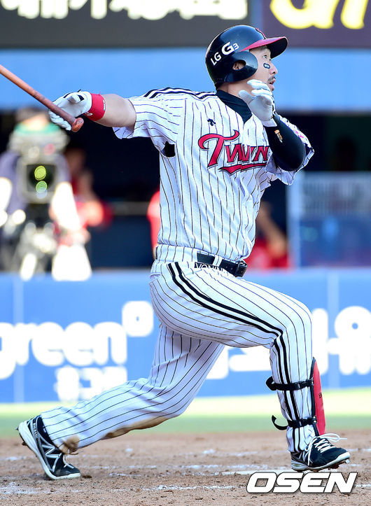2회말 LG 공격 2사 만루 상황 이병규가 싹쓸이 3타점 우익수 키를 넘기는 2루타를 날리고 있다.