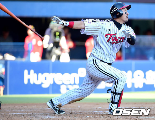 2회말 LG 공격 2사 만루 상황 싹쓸이 3타점 우익수 키를 넘기는 2루타를 날리고 있다.