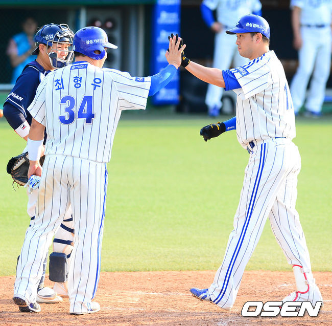 15일 오후 대구구장에서 열린 2014 한국야쿠르트 세븐 프로야구 삼성 라이온즈와 두산 베어스의 경기,3회말 1사 2루 삼성 채태인이 역전 2점 홈런을 날리고 홈에서 2루 주자 최형우와 하이파이브를 하고 있다.