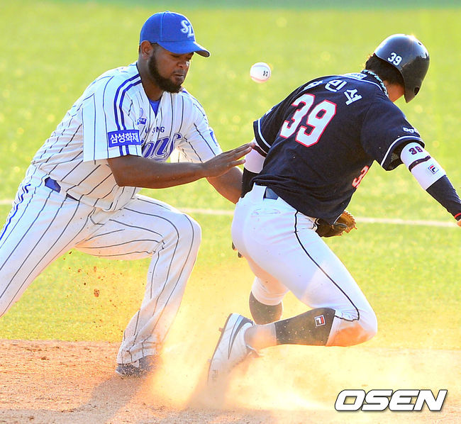 15일 오후 대구구장에서 열린 2014 한국야쿠르트 세븐 프로야구 삼성 라이온즈와 두산 베어스의 경기,5회초 2사 1루 두산 민병헌의 타석때 1루 주자 장민석이 도루 성공하고 있다.