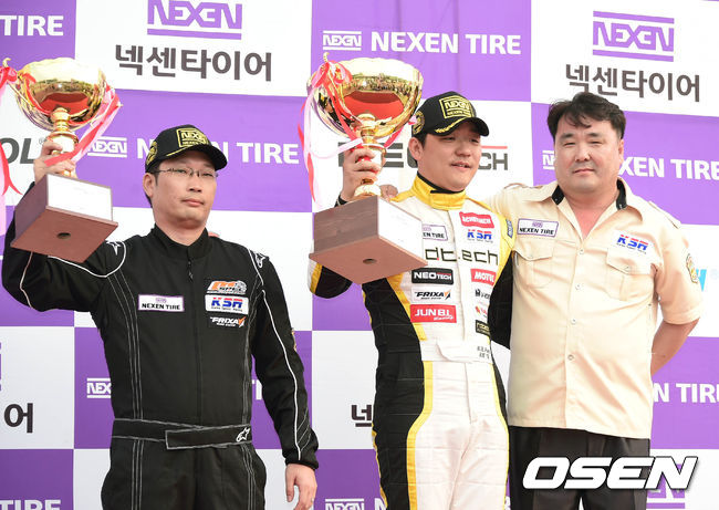 국내 최대규모의 모터 스포츠 축제 '2014 넥센타이어 스피드레이싱' 2전이 15일 영암 코리아인터내셔날서킷에서 열려 B/K 원메이커 1위를 차지한 박병환 2위 김형준이 시상대에서 기념사진을 찍고 있다. 시상은 KSR 김기혁 대표가 했다.