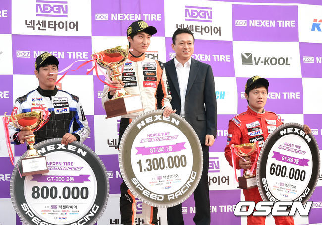 국내 최대규모의 모터 스포츠 축제 '2014 넥센타이어 스피드레이싱' 2전이 15일 영암 코리아인터내셔날서킷에서 열려 투어링 A 1위를 차지한 나창규 2위 서상도 3위 이태관이 시상대에서 기념사진을 찍고 있다. 시상은 넥센타이어 마케팅 최상규 팀장이 했다.