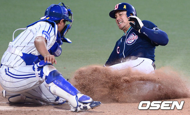15일 오후 대구구장에서 열린 2014 한국야쿠르트 세븐 프로야구 삼성 라이온즈와 두산 베어스의 경기,7회초 1사 2,3루 두산 김재호의 내야땅볼때 3루 주자 홍성흔이 홈에서 태그아웃되고 있다.