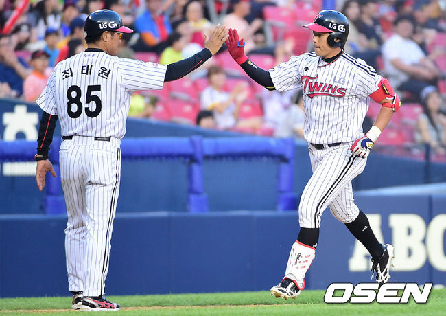 6회말 LG 공격 2사 만루 상황 백창수가 좌월 만루포를 날리고 그라운드를 돌며 최태원 코치와 인사를 나누고 있다.