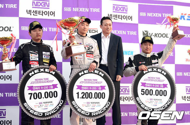 국내 최대규모의 모터 스포츠 축제 '2014 넥센타이어 스피드레이싱' 2전이 15일 영암 코리아인터내셔날서킷에서 열려 TT 300 1위를 차지한 김범한 2위 조중섭 3위 최광성이 시상대에서 기념사진을 찍고 있다. 시상은 넥센타이어 마케팅 최상규 팀장이 했다.