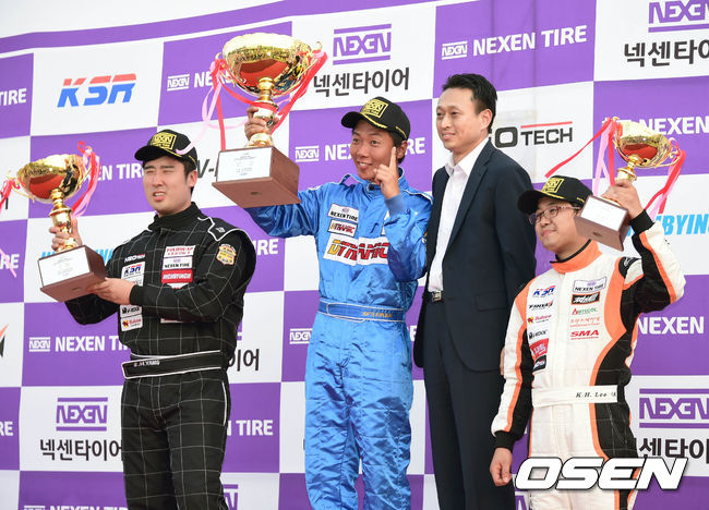 국내 최대규모의 모터 스포츠 축제 '2014 넥센타이어 스피드레이싱' 2전이 15일 영암 코리아인터내셔날서킷에서 열려 로디안 TT 1위를 차지한 박찬웅 2위 양승무 3위 이관호가 시상대에서 기념사진을 찍고 있다. 시상은 넥센 타이어 마케팅 최상규 팀장이 했다.