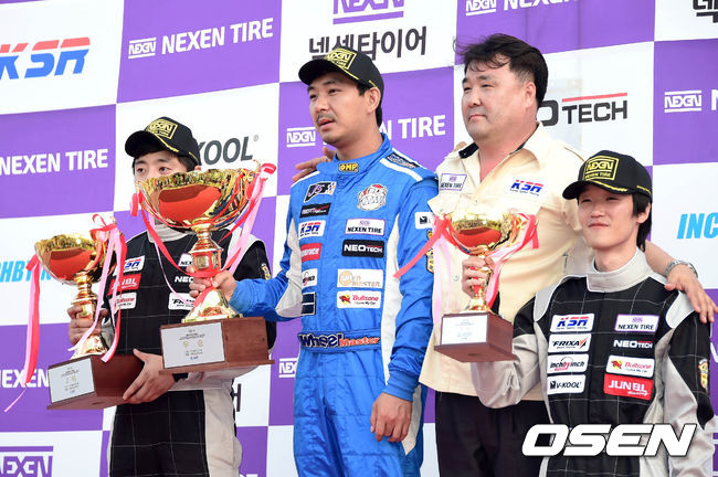 국내 최대규모의 모터 스포츠 축제 '2014 넥센타이어 스피드레이싱' 2전이 15일 영암 코리아인터내셔날서킷에서 열려 TT 200 1위를 차지한 안경식 2위 최관용 3위 조윤성이 시상대에서 기념사진을 찍고 있다. 시상은 KSR 김기혁 대표가 했다.