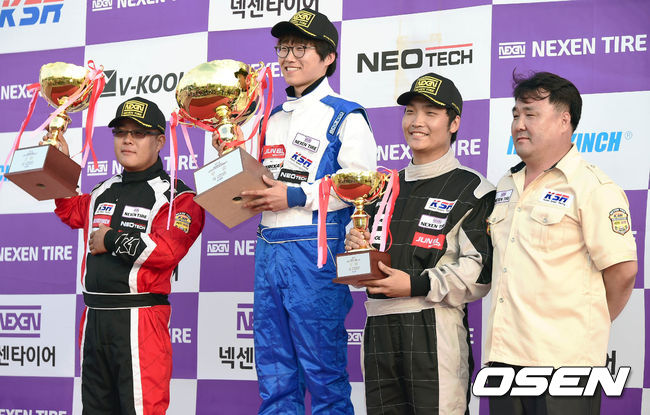 국내 최대규모의 모터 스포츠 축제 '2014 넥센타이어 스피드레이싱' 2전이 15일 영암 코리아인터내셔날서킷에서 열려 준비엘 챌린지 1위를 차지한 이택현 2위 오진섭 3위 조정기가 시상대에서 기념사진을 찍고 있다. 시상은 KSR 김기혁 대표가 했다.