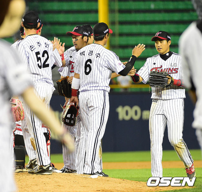 LG 선수들이 마운드에서 하이파이브를 나누고 있다./dreamer@osen.co.kr