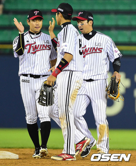 경기 종료 직후 LG 백창수, 채은성, 이병규가 하이파이브를 나누고 있다./dreamer@osen.co.kr