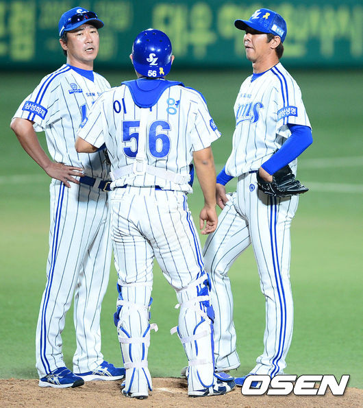 9회초 2사 1,2루 상황에서 삼성 김태한 코치가 마운드에 올라와 임창용 마무리 투수와 이야기를 나누고 있다./ soul1014@osen.co.kr