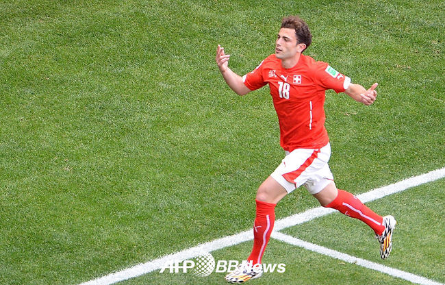 후반 스위스 아드미르 메메디가 골을 성공시키고 환호하고 있다.