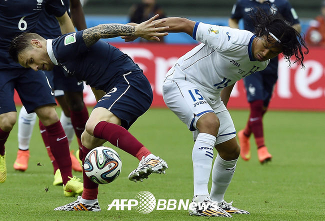 전반 프랑스 마티외 드뷔시와 온두라스 로저 에스피노사가 볼다툼을 하고 있다.