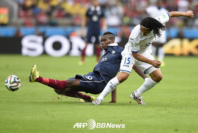 전반 프랑스 폴 포그바와 온두라스 로저 에스피노사가 볼다툼을 하고 있다.