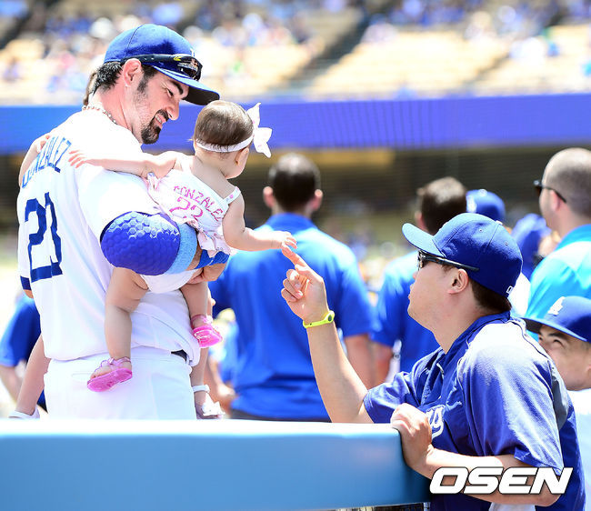 경기전 류현진이 곤잘레스의 아이들과 인사를 나누고 있다.