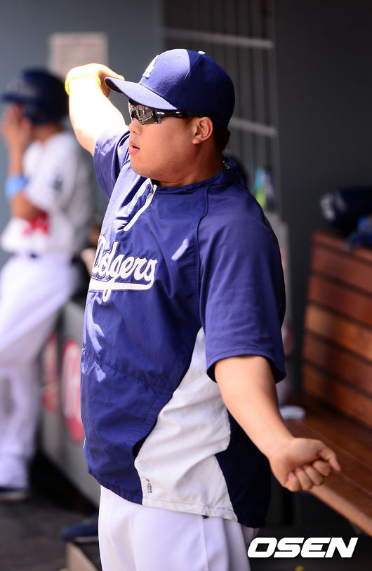 류현진이 더그아웃에서 몸을 풀고 있다.