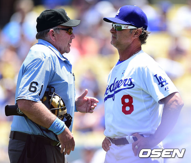 1회말 1사 LA 다저스 돈 매팅리 감독이 라미레즈의 홈런성 파울타구에 대해 비디오 판독을 요청하고 있다.