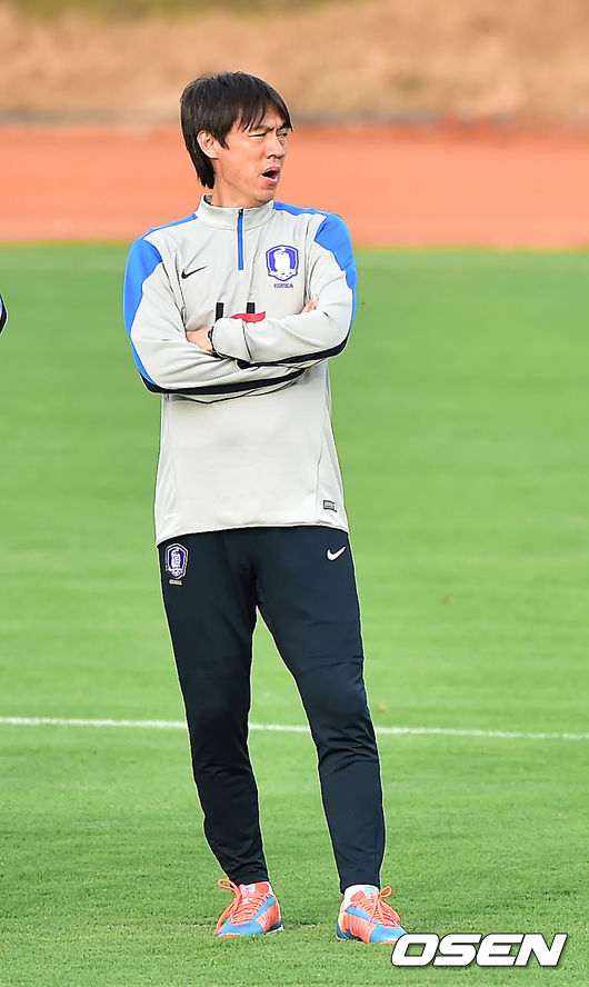 홍명보 감독이 훈련장에서 하품을 하고 있다.