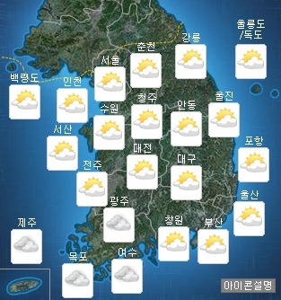 낮 최고기온은 24도에서 31도로 어제와 비슷하겠다. 미세먼지(PM10)는 전국이 보통(일평균 31~80㎍/㎥) 수준이다.
