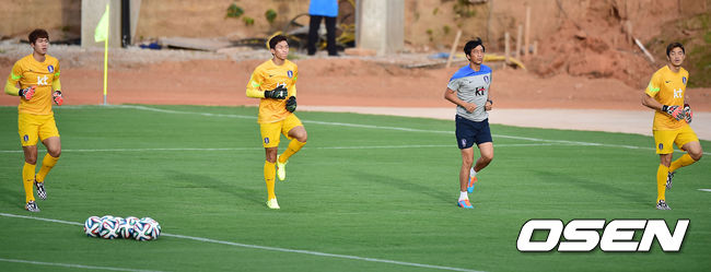 16일 오후(이하 한국시간) 홍명보감독이 이끄는 한국 축구대표팀이 2014 브라질 월드컵 조별리그 첫 경기가 열리는 쿠이아바로 이동해 마토 그로수 대학교 내에 위치한 훈련장에서 첫 훈련을 가졌다. 이범영 김승규 정성룡이 김봉수 코치와 몸을 풀고 있다.