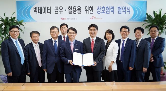 SK텔레콤(대표이사 사장 하성민, www.sktelecom.com)과 한국도로공사(사장 김학송, www.ex.co.kr)가 16일 양해각서(MOU)를 체결하고 양측이 보유한 빅데이터를 공유하고 공동 활용하기로 했다.