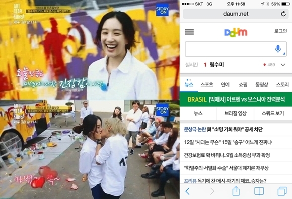 정려원이 게재한 사진은 포털사이트 실시간 이슈 검색어 순위의 일부분으로, 림수미가 1위레 랭크돼 있어 눈길을 끈다. 이는 이날 방송된 '아트스타 코리아'에서 림수미가 정려원에게 입을 맞추는 깜짝 퍼포먼스를 했기 때문.