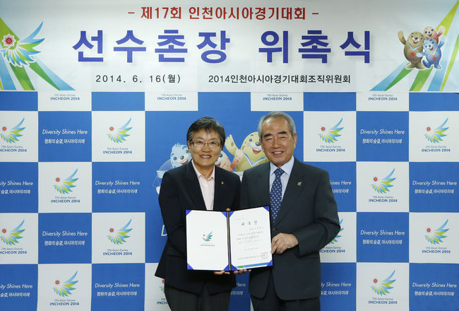2014인천아시아경기대회 조직위원회(위원장 김영수)는 16일 송도 미추홀타워 조직위 영상회의실에서 선수촌장 위촉식을 갖고 이에리사 의원을 선수촌장에 선임했다.