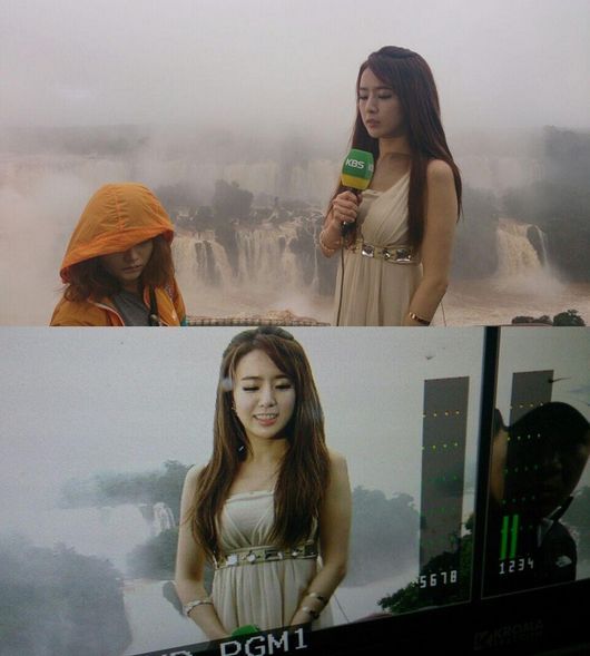 사진 속에서 정지원 아나운서는 여신을 연상케 하는 시폰 드레스를 입고 이구아수 폭포 앞에서 방송을 진행하고 있다. 특히 정지원 아나운서는 글래머러스한 몸매를 과시 눈길을 사로잡는다.