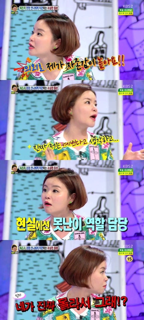 그는 “개그우먼이 됐는데 못난이 역을 몰아줬다”며 “그래서 PD에게 못나지 않았는데 왜 못난이 역만 주냐고 따졌다”고 말했다. 그러자 PD는 "네가 진짜 몰라서 그래? 라고 반문했다"고 말해 웃음을 자아냈다.
