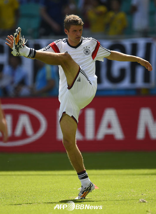 경기에 앞서 독일 뮐러가 그라운드에서 몸을 풀고 있다.