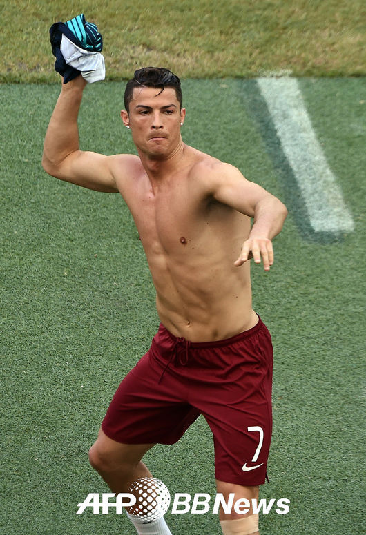 경기에 앞서 포르투갈 호날두가 워밍업을 마치고 유니폼을 팬들에게 던져주고 있다.