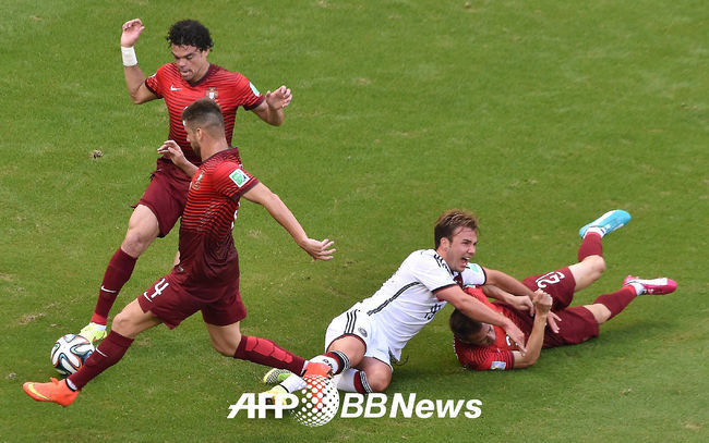 전반 11분 골문을 돌파하던 독일 괴체가 포르투갈 페레이라의 파울에 그대로 넘어지며 페널티킥을 얻어내고 있다.