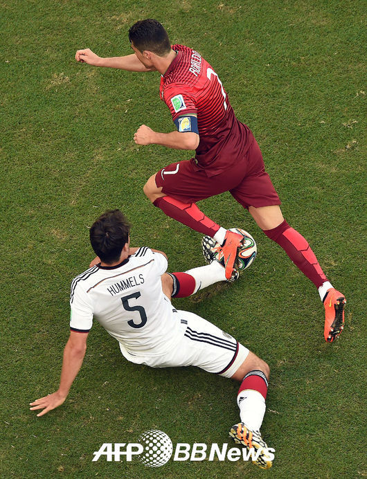 독일 후멜스가 포르투갈 호날두에 태클을 하며 볼을 차단하고 있다. / photo@osen.co.kr < 사진 > ⓒAFPBBNews = News1